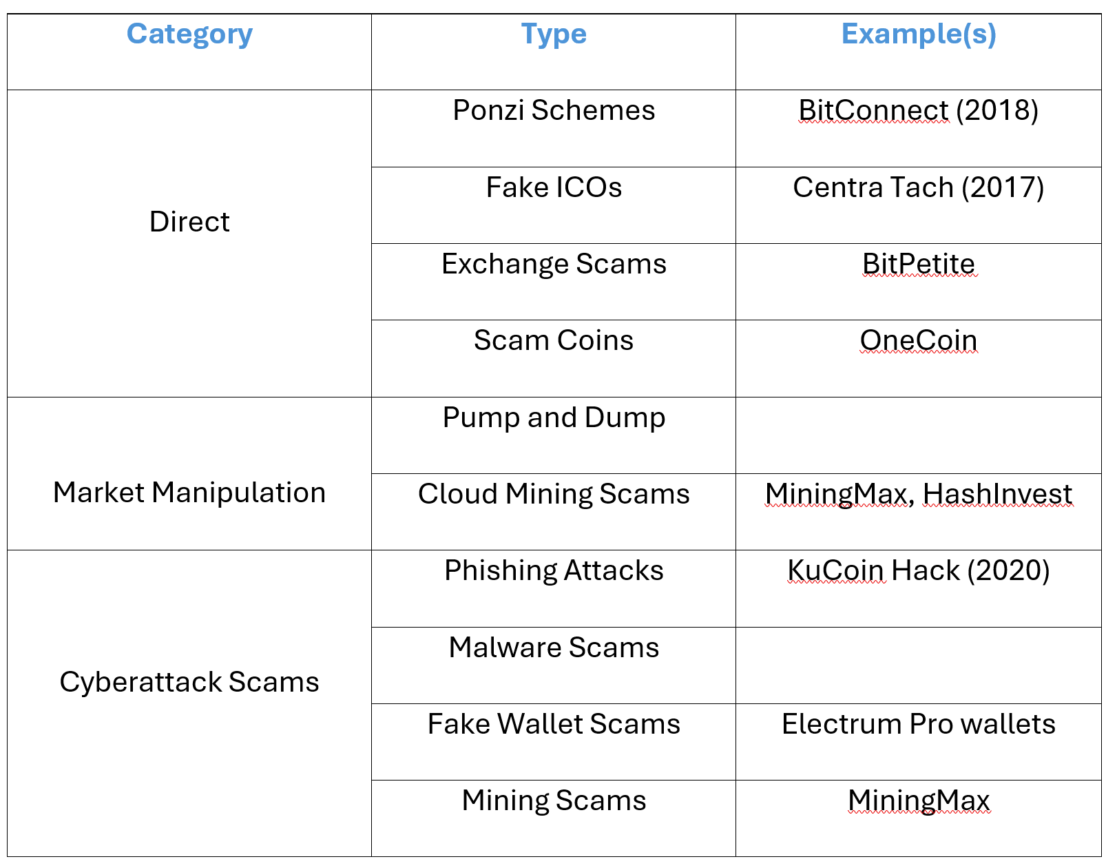 Perdana and Jiow (2024) provide a comprehensive classification of crypto scams, categorising them into the following: